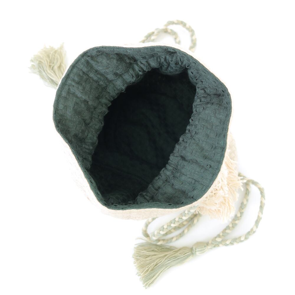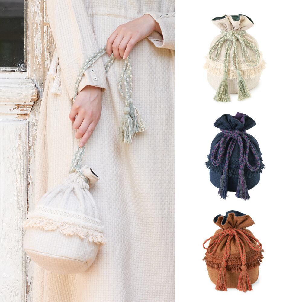 VANVES=パリの蚤の市の名前。ブロック模様がふっくらと織られたドットカディというコットン生地を使用。フリンジ・レースやタッセルでフォークロア感たっぷりに装飾しました。これひとつで出かけられるサイズ感のミニ・巾着バッグです。