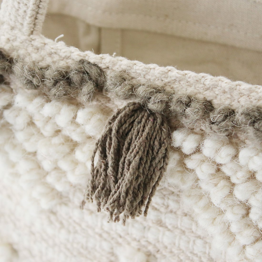 コットンの生地に羊毛(ウール)の玉を手作業で引き出して柄を表現したトートバッグ。